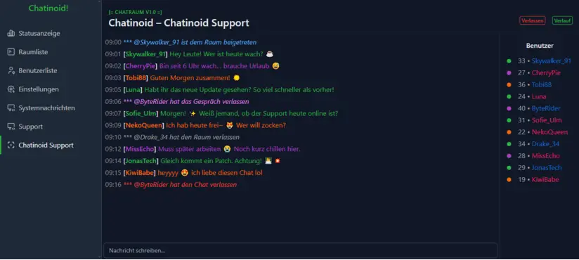 Ob im privaten Eins-zu-Eins-Chat oder gemeinsam in thematischen Räumen – bei Chatinoid kannst du sogar mehrere Räume parallel nutzen. Du entscheidest jederzeit selbst, wo und mit wem du kommunizierst.